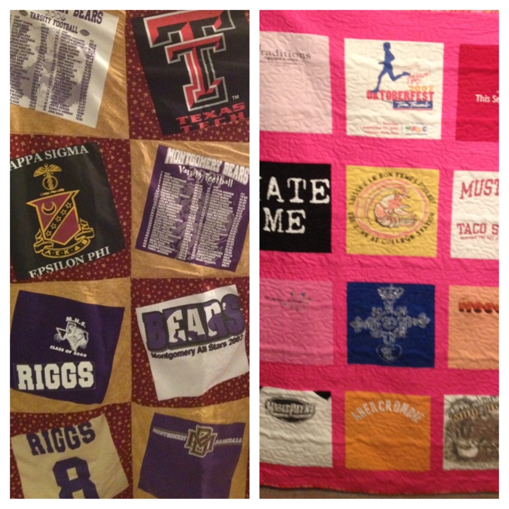 More T-Shirt quilts! Posted on January 18, 2013 by bethanywomack 0 The cold weather means lots of business (maybe I shouldn’t live in Texas). This is a picture of my 2 latest quilts. Share this: Share on X (Opens in new window) X Share on Facebook (Opens in new window) Facebook Like Loading... Related