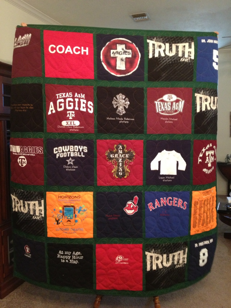 Toni’s t-shirt quilt Posted on February 3, 2013 by bethanywomack 0 I recently visited a dear friend of mine to help her put the finishing touches on a t-shirt quilt. This is the final product. I just love how every t-shirt quilt has its own memories to share. Share this: Share on X (Opens in new window) X Share on Facebook (Opens in new window) Facebook Like Loading... Related